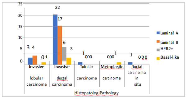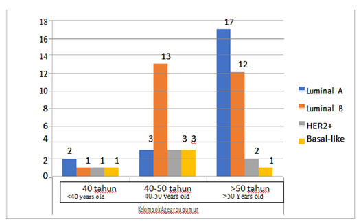 From the 59 samples, 48 patients has a pathological result of invasive ductal carcinoma, 8 patient with invasive lobular carcinoma and only 1 patient has a pathological result of ductal carsinoma in situ. There were two patient with other invasive pathological type (tubular carcinoma and metaplastic carcinoma) (Table 2) (Figure 6). Based on pathological grading, most (29 subjects) has grade III cancer, 22 subjects has grade II and only 8 subjects has first grade cancer (Figure 2). Most (27 subjects) has Luminal A subtype, 21 subjects has Luminal B, 6 subjects has HER2+ and only 5 subjects has the basal-like subtype (Table 3) (Figure 7). The results showed that within the Luminal A subtype group, most has invasive histopathology of ductal carcinoma 77.8% (21 people), grade II was 44.4 %% (12 people), and in the age group over 50 years was 66, 7% (18 people). Within the Luminal B group, most has invasive ductal carcinoma histopathology 81% (17 people), grade III is 42.9% (9 people), and in the age group of more than 50 years is 52.4% (11 people). Within the HER2+ subtype group, all has invasive ductal carcinoma, grade III amounted to 66.7% (4 people), and in the 40-50 years age group as many as 50% (3 people). Within the basal -like subtype group, most has invasive ductal carcinoma 60% (3 people), grade 3 100% (5 people), and in the 40-50 years age group as many as 60% (3 people) (Table 4).