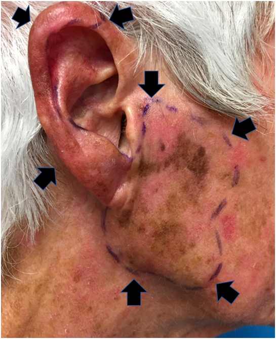 Lentigo maligna (LM) is an early form of melanoma and its incidence is rising.1 It presents commonly on the head and neck (Figure 1) where surgery can be problematic. Tissue conserving therapies such as radiotherapy (RT) and topical treatments, like imiquimod, are attractive. As LM is quite superficial, it particularly lends itself to treatment with superficial radiotherapy (SXRT). In order to enhance accrual to an international randomised trial,2 a monthly face-to-face multidisciplinary LM clinic attended by dermatologists and radiation oncologists is ongoing. This clinic provides a learning opportunity to observe how different specialists approach LM. Dermatologists regularly use the topical immune response modifier, Aldara® (imiquimod), and treat LM until a certain level of skin inflammation is achieved. If the required level of inflammation is not observed, a dose escalation protocol is initiated.3 In radiation therapy, the same level of required reaction is equivalent to wet desquamation. Radiation oncologists, however, treat to a set dose4,5 irrespective of the observed skin reaction at treatment completion. Some patients attending the multidisciplinary LM clinic were diagnosed as having atypical intraepidermal melanocytic proliferation (AIMP) or early LM (ELM). AIMP is characterised by an increased number of melanocytes along the basal epidermal layer but without enough atypia to diagnose LM.6 Lesions with AIMP cannot be classified as either benign or malignant, particularly when only small partial biopsies have been carried out.7 These patients did not meet the trial inclusion criteria but were offered protocol treatment anyway. Patients who preferred the option of RT were treated as per the protocol even though the exact RT dose for AIMP is unknown. A comprehensive review by Ennslin et al.7 cites studies that used topical therapy for the non-surgical treatment of AIMP but RT is not mentioned. We present a case series of five patients with AIMP or ELM who were found to have recurred following radical treatment with radiotherapy.