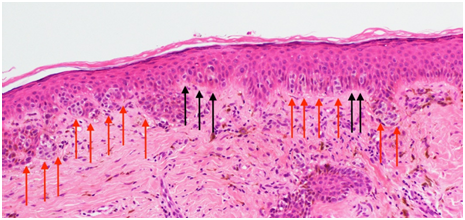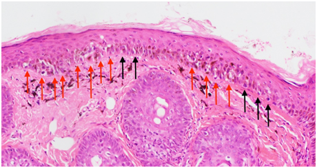 The five cases all recurred in-field despite having been treated with an RT protocol that is meant to cure more malignant in-situ disease. This raises several interesting questions. First, what radiation dose is required to cure AIMP and ELM? The total dose needed to cure in-situ skin cancer varies between radiation oncologists, and different approaches are well summarised in a review by Zygogianni et al.10 which investigated the use of RT to treat in-situ cutaneous squamous cell carcinoma. Some radiation oncologists are of the opinion that the same dose as invasive disease is needed; others suggest that a dose reduction is possible due to decreased invasiveness. Our case series suggests that very early pre-invasive disease, such as AIMP and ELM, needs at least the same, if not a higher, RT dose than established in-situ disease. One hypothesis is that AIMP and ELM, being more like normal tissue, may be capable of more inter-fraction repair11 and therefore require a greater dose. Another is that previous surgery (n=2) introduces fibrosis and causes hypoxia, resulting in acquired radioresistance, especially in the central portion where in-field failure was shown on biopsy post treatment. Second, do radiation oncologists need to adapt the dose of RT to the skin reaction? The peak acute RT reaction experienced by our patients was only dry desquamation in in-field normal skin. Would it not be better to treat until patients achieve a certain skin reaction, in the same way that dermatologists use imiquimod? This would mean using the RT reaction in surrounding in-field normal skin as a real time clinical in-vivo measurement of individual radiation sensitivity. As the peak RT reaction coincides with the end of treatment with standard fractionation (2Gy or less), it may be advisable to use standard fractionation to enable extra dose to be added if the desired skin toxicity is not reached by the end of the initial prescription.