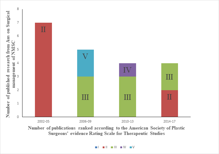 Method: Surgical (Sx) and radiotherapy (RT) treatment sections were interrogated. The analysis was simple. Each reference was counted as one unit. The quantity assessment was carried out by categorizing the references according to their country of origin: Australia, United Kingdom (UK), United States (US) and European Union (EU) countries, which were grouped as one country (EU) for the purpose of this study. The number of references from each country were then added up. To assess for quality, all references were ranked according to the American Society of Plastic Surgeons (ASPS) rating scale. A quality ratio for each country was then calculated by dividing the total number of prospective trials (i.e., levels I and II) by the number of retrospective studies (level III and lower) from each country if the numbers were sufficient. To evaluate the Australian improvement since 2008, Australian references were first categorized according to their year of publication (2002 to 2017), and then allocated to one of four bins of class intervals representing time periods.