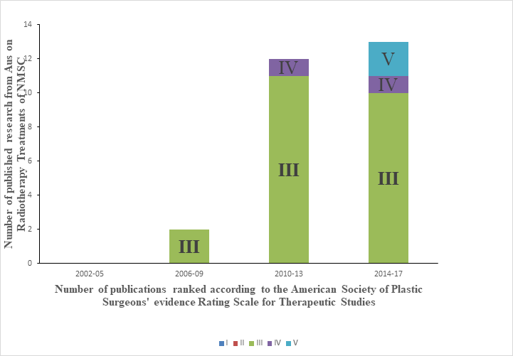 Figure 2: References over time for radiotherapy treatments using a stacked column graph. The vertical axis shows the number of references. The columns show the total number of references divided into the quality stacks according to their rank on the American Society of Plastic Surgeons' evidence Rating Scale for Therapeutic Studies. The references were then allocated according to year of publication (2002 -2017), in four-year intervals. Legend: I, II, III, IV and V are the levels of evidence according to American Society of Plastic Surgeons (ASPS) rating scale for therapeutic studies.9
