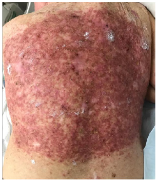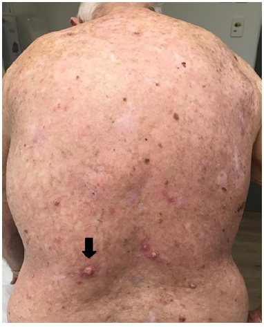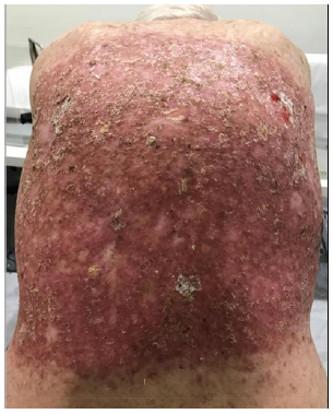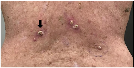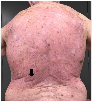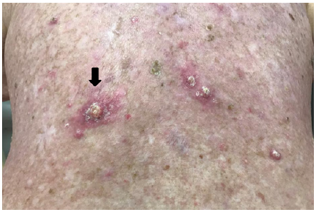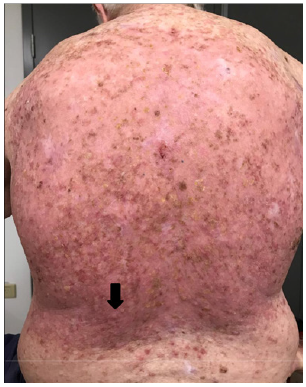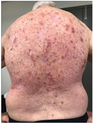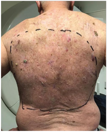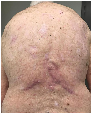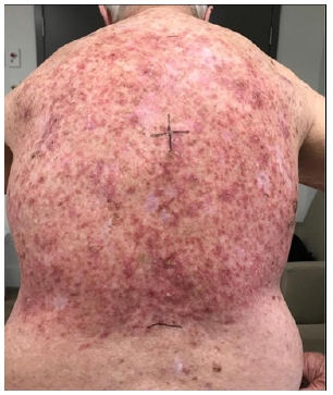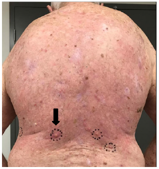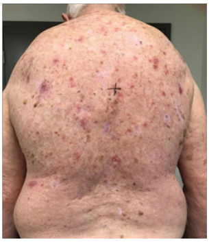 A well, immunocompetent 84-year-old Caucasian male presented with extensive SFC of his back from decades of sun exposure (Figure 1). He had had multiple excisions for invasive skin cancers from his back, increasingly over the previous 30 years. The convalescence from each surgery was interfering with his quality life and he sought a non-surgical option.
