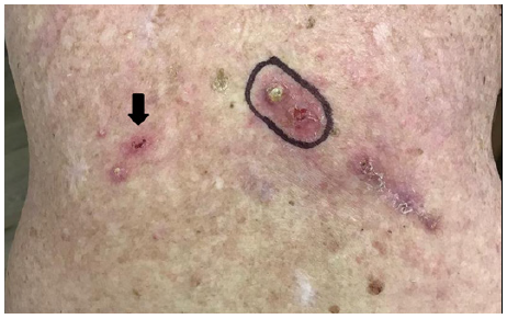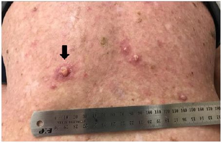 G. 24 days post RT - keratoacanthoma-type lesions were observed arising on the patients back within the treatment field.