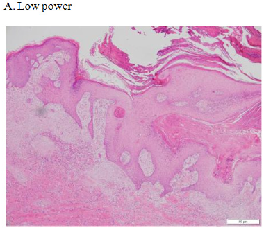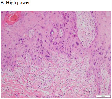 At 96 days post RT a lower right lesion was surgically removed–see histopathology in Figure 4. At 150 days post RT the index KA had fully resolved. No lesion has since recurred locally or regionally after 10 months of follow up. At 96 days post radiotherapy excision biopsy histopathology of the lower right lesion indicated in 3M revealed a squamous proliferative lesion. Parts of the lesion resembled KA, elsewhere the tumour showed features of well differentiated SCC (Figure 4).