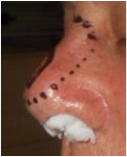 A well, immunocompetent 81-year-old Caucasian male presented with a lesion on the tip and bridge his nose which was confirmed on punch biopsy as moderately differentiated SCC invading the dermis to a depth of 1mm. The nose had previous surgery for BCC many years prior and the current SCC arose from under the flap of this previous surgery. The patient was not keen on further surgery. The patient was considered suitable for curative intent VMAT therapy and he consented to RT.