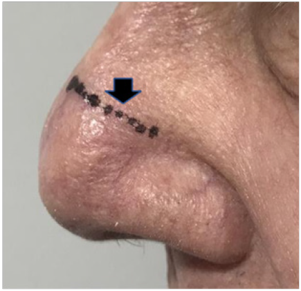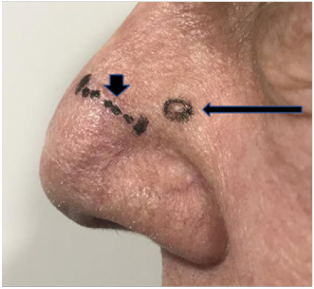 B. Lateral nose 85 days after RT. Photo shows scar marked with short vertical black arrow Lesion in 36 Gy zone has now spontaneously resolved confirming KA status.