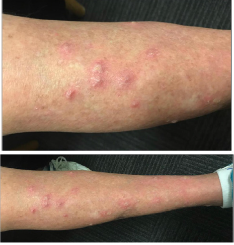 On review 42 days after treatment, the field changes in the upper limb had resolved, with no evidence of residual keratoses. However, in the lower limb the patient reported multiple rapidly enlarging, tender, hyper-keratotic lesions emerging throughout the irradiated lower limb field (Figure 7) and beyond. These were first noted approximately 21 days after completion of radiotherapy and had increased in size and number in the following weeks. Clinically the lesions resembled KAs, and the diagnosis was verified clinically by the patient’s dermatologist. A dominant persisting lesion on the foot was excised with histopathology confirming a hyperkeratotic squamo-proliferative lesion in keeping with keratoacanthoma. This lesion was outside the RT field. No such lesions were identified within the treated upper limb field. The patient was commenced on oral acitretin 10mg alternate days, approximately 8 weeks after radiotherapy. The medication was well tolerated and the majority of lesions became crusted, indurated and regressed. The dose of acitretin was increased to 10mg daily after several months but was ceased due to dry eyes and lips. A number of small KA lesions were observed to persist 6 months after completion of radiotherapy, and her acitretin dose was restarted at the alternate day dose, increased to 10mg daily, before being ceased due to mild cognitive impairment. Complete resolution finally occurred 300 days (10 months) after completion of radiotherapy. These case finding are summarised in Table 2.