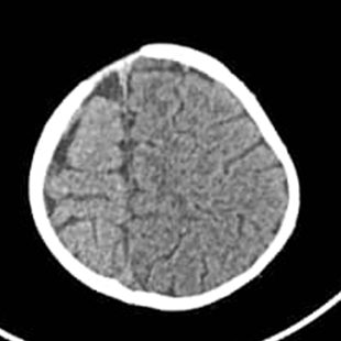 We report in this paper the picture of a child K, male, 1-year-old, weighing 9 kg, received at the neuropsychiatric center. Born at term, normal delivery with a birth weight of 4,100 kg. One day later, he was put in an incubator without oxygenation. He is the 7th in a family of 7 children with a history of malformation reported in the family or epileptic seizures. Her mother reports regression in milestone (speech and walking). On examination, we find cranial dysmorphism made up of an asymmetrical head with the right hemiface more prominent than the left (Figure 1), right hemicorporal erythroderma from head to foot taking the inner and posterior face (Figure 1) and describing an atypia by taking half of the sole of the right foot (Figure 2) while the left hemibody is of normal colour. There are left hemicorporal tonic-clonic convulsive seizures which become generalized secondarily and are undergoing. A treatment consisting of valproic acid syrup at 30 mg/kg and injectable dexamethasone at 1 mg/kg made it possible to control the attacks after a failure of treatment with phenobarbital which was administered at the referral hospital. A performed sleep EEG showed spikes and some wave spikes localized to the rigth hemisphere, A performed cerebral computed tomography shows on an axial section a cerebral hemiatrophy of the right hemipshere (Figure 3) with a double cerebral cortex in the frontal region and polymicrogyria (Figure 4). A basic biological assessment carried out and not contributory.