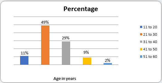 Table 1 shows particular of the patients. It was observed that nearly half (49.0%) of the patients belong to the age group 21-30 years. The mean age was found 29.8±8.3 years with a range from 17 to 52 years.
