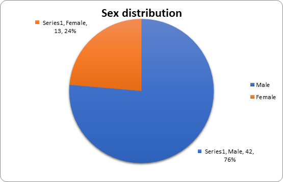 Regarding sex distribution, it was observed that male was 42 (76.0%) and female were 13 (24.0%). Male to female ratio was 3.2:1.