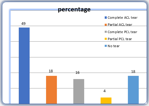 Complete and partial PCL tears were present in 9 (16.0%) and 2 (4.0%) patients respectively. ACL & PCL were normal in 10 (18.0%) patients.