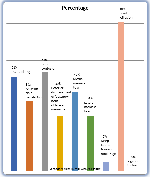 Table 5 shows secondary signs of ACL injury in MRI. It was observed that majority had joint effusion (81.0%). Around half of the patients with ACL injury had buckling of PCL (51.0%), bone contusion (54.0%) and medial meniscal tear (43.0%).14 (38.0%) patients had anterior tibial translation, 11 (30.0%) patients had posterior displacement of posterior horn of lateral meniscus and lateral meniscal tear. Only 2 (5.0%) patients had deep lateral femoral notch signs. And no patient had Segond fracture.