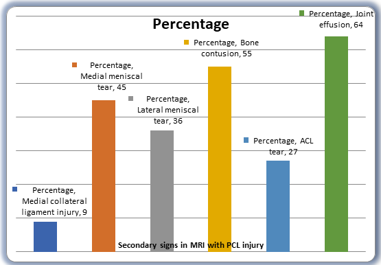 Table 6 shows secondary signs of PCL injury in MRI. It was observed that most of them had joint effusion (64.0%). 6 (55.0%) patients had bone contusion. 5 (45.0%) and 4 (36.0%) patients had medial and lateral meniscal tear respectively. Only 1 patient had medial collateral ligament injury. And 3 (27.0%) patients with PCL injury were combined with ACL injury as well.