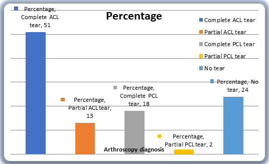 Table 7 shows the arthroscopy diagnosis of the patients. It was observed that complete and partial tears of ACL were present in 28 (51.0%) & 7 (13.0%) patients respectively. Complete and partial tears of PCL were present in 10 (18.0%) & 1 (2.0%) patients respectively.13 (24.0%) patients had normal ACL and PCL.