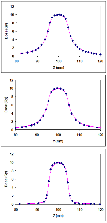 Figure 2 Simulation of Leksell Gamma Knife C model in x, y, z directions. The diamond points are the data from LGK TPS. The solid line is from the computed model.