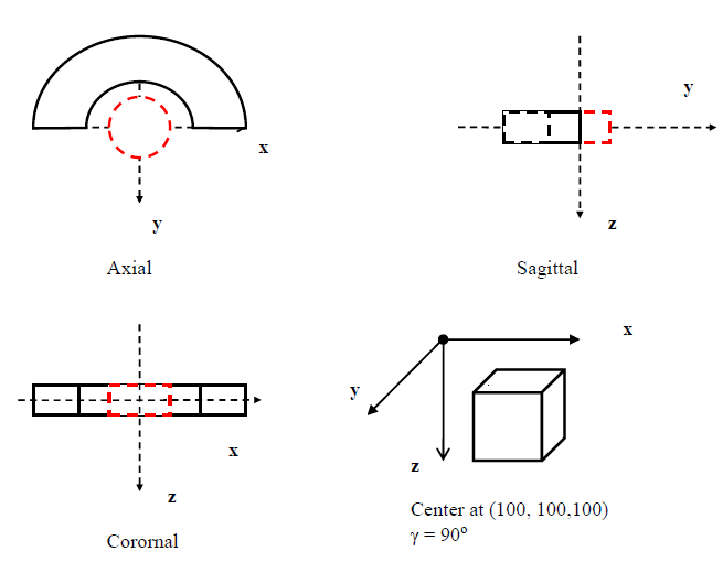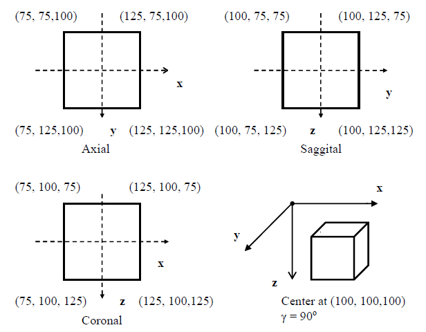 Figure 3 shows the cube that we generated by simulating the frame coordinate system of the LGKTPS. The center of the cube coincides with the center of the frame (which is x=100, y=100, z=100); and the axial plane bisects the cube at Z=100. The cubic volume was fixed for testing purposes. The insufficiency of the pixel counting computation method was illustrated by calculating the volume based on grid size variations. Figure 4 shows the effect of grid size on the computation. Obviously, different grid (voxel) sizes generate different volume percentages for the cube, even though the grid size is large enough to cover the entire cube. In figure 4, the grid size was too small to cover the cube; therefore, it was possible that the calculated volume would be different from the full volume of the cube. In Figure 5, for the upper figure, the voxel size is set to 0.06 of the length of the edge of the cube. The calculation results in 289 voxels inside the boundary; and the voxel calculation method results in a volume that is about 104% of the cube. The lower figure shows that if the voxel size is set at 0.01 of the length of the edge of the cube, the resulting 961 voxels would cover only 38% of the real volume.