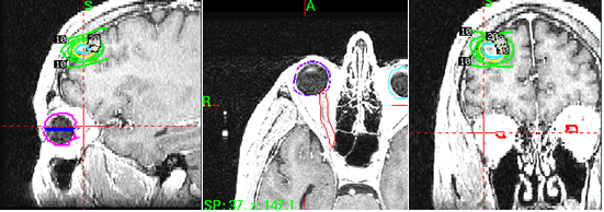 Eye lens dose is a concern in radiation treatment of ocular cancer.10,11 However, determining which beam should be plugged is difficult, especially when the eye lens is far away from the treatment target. Figure 10 illustrates such a circumstance. Combining the Monte Carlo integral dose model and the analytical dose model, we can easily generate a blocking pattern that will decrease the eye-lens dose by more than 50%. This result is shown in Table 1. In this case, we prescribed the dose to average center of the 9 shots. The critical structure was defined as the lens of the right eye, and reference point dose was prescribed to the center of this structure. The dose was decreased is up to 81.7% by selecting 3 beams to block. These data suggest that blocking beam selection is a mechanism that is sufficiently sensitive and effective for integral dose calculation. Therefore, the Monte Carlo integral dose calculation method can be an effective tool in selecting beams to block to protect organs at risk in Gamma Knife treatment plans.
