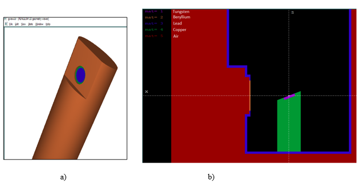 Figure 1 Simulation of the X-ray tube, model MXR160: Beryllium exit window with thickness of 0.8 mm and lead shield. a) 3D view and, b) Y-axis point of view (2D).