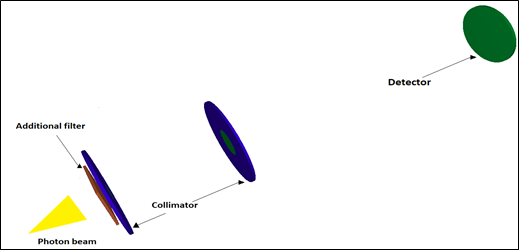 Figure 2 Modeled array used in stage 2 of the simulations. Lead collimator at 30 cm from the source, radius of 1.5 cm and thickness of 5 mm, and another lead collimator at 50 cm from the source, radius of 2.5 cm and thickness of 4 mm, and air detector at 1 m. The photon beam is illustrative only.