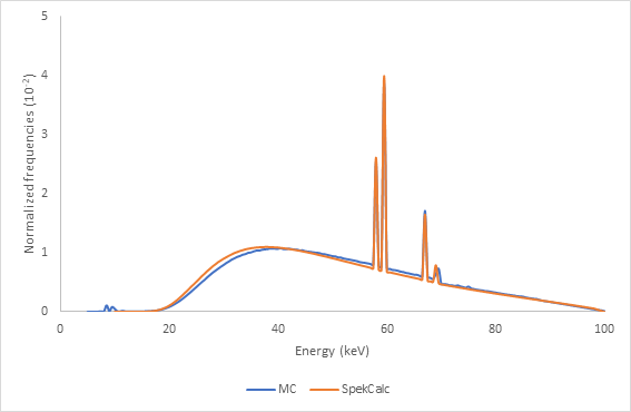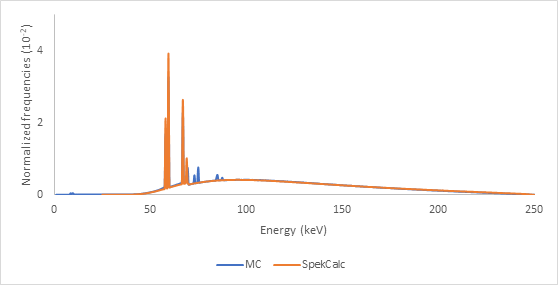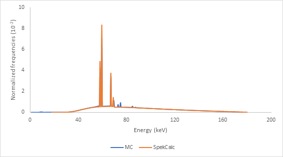 In contrast, the SpekCalc software is a commercial program widely used to obtain photon spectra in the range between 40 kVp and 300 kVp from specific x-ray tubes with tungsten target for different anode angulations and different combinations of additional filtrations obtained under known conditions as “good geometry”, that is, without scattering. It is based on mixing deterministic equations to calculate the Bremsstrahlung X-ray production together with electron distributions pre-calculated using the MC method.17