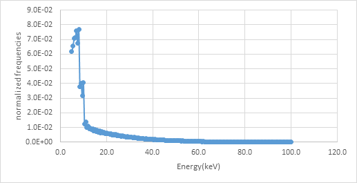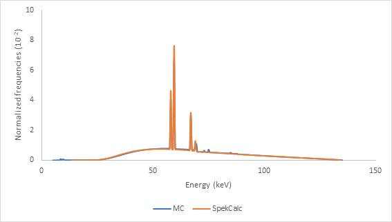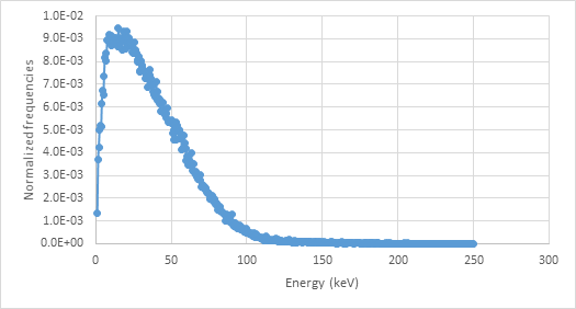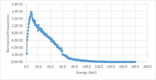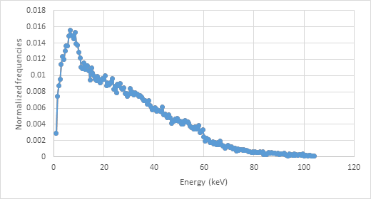 The mean energy was calculated by multiplying the normalized frequency of x-ray times the corresponding energy value (Y-axis from spectra figures), using equation 3. Mean energy values were compared with those found by the Laboratoire National Henri Becquerel (LNE-LNHB).26