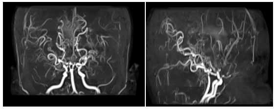 Figure 4 Arterial Angio-MRI: Interruption of the two internal carotid arteries in their C1 end segment, which are of reduced caliber in their intracavalous pathway with absence of individualization of the proximal segments of the 2 anterior and posterior cerebral arteries with evidence of a fine network at the "pseudomoya" base.