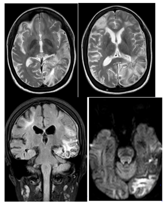 Figure 3 Angioplasty MRI performed in emergency: in the 3 planes of space in T1, T2, FLAIR and arterial angio-RM: Presence of multiple bilateral hemispherical lesional foci of cortico-subcortical topography in hyper signal T2 and FLAIR , hypo-signal diffusion in the frontal bilateral, parieto-rollodial right and associated with signal abnormalities of the white matter under cortical and gray nuclei bilaterally of chronic vascular pace.with the presence of a beach lesional temporo-parieto-occipital left in hyper signal T2, FLAIR and diffusion b1000, erasing the cortical furrows with mass effect on the occipital intersection.