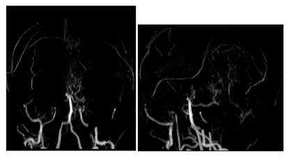 Figure 2 Arterial Angio-MRI in flight time: absence of visualization of the supraclinoid segments of the internal carotids as well as the proximal portions of the anterior and middle cerebral. A cortical anastomotic network is located at the base and visualization of the distal segments of the cerebral arteries where the flow is slowed down.