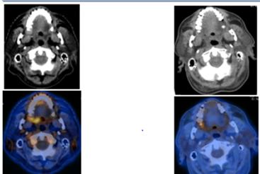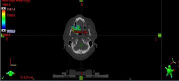 68yr old male who underwent Right kidney transplant for non-functional bilateral kidney presented in with carcinoma of soft palate cT2N0M0.PET CT scan without contrast revealed 1x2x2.7cm soft tissue density mass in the right soft palate and perialveolar region in right upper third molar suggestive of carcinoma soft palate extending to alveolus with suv 3.5 as shown in Figure 2. Biopsy revealed squamous cell carcinoma, for which he was treated with Radiation using Intensity modulated radiation therapy (IMRT) to the dose of 70Gy in 35 fraction over 7 weeks with weekly 5 fraction. In Figure 1 the 70Gy dose distribution was shown in colour wash over the gross disease. Chemotherapy was not considered because of renal compromise and it was stage 2 disease. Patient had complete response of the disease and was on regular follow up.