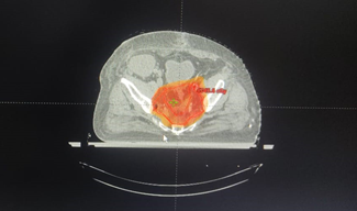 Postop histopathology of liver showing moderately differentiated hepatocellular carcinoma and Rectum showing moderately differentiated adenocarcinoma of rectum with free margins and free regional lymph nodes with perirectal tumor deposits pT3N1c. He received adjuvant external beam radiotherapy in view of T3 and node positive using Image guide radiotherapy (IGRT) to a dose of 45 Gy in 25 fractions to the post op bed and nodes in pelvis followed by 5.4 Gy in 3 fractions boost to the post-operative bed as shown in Figure 3 along with concurrent chemotherapy with oral capecitabine The patient received stereotactic body radiotherapy(SBRT) using CyberKnife to a dose of 30 Gy in 5 fractions to postop bed of liver using gold fiducial and synchrony respiratory tracking as shown in Figure 4. SBRT to liver considered in view of close margin 2mm.now on one and half year follow up whole body PET scan as shown in Figure 5 revealed no active disease and patient have a good quality of life.