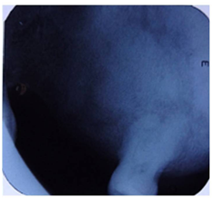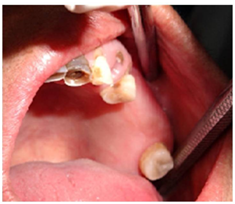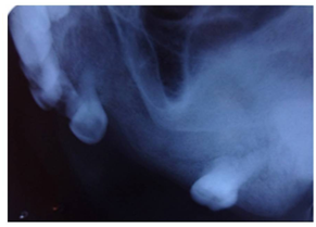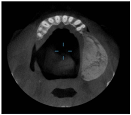 A female aged 66years reported to the department of Oral Medicine and Radiology of SGT Dental College with the complaint of painless swelling in the upper jaw since 2years that was slowly progressive in nature. The patient had a history of hypertension and was on medication since 4years for the same. Her dental history included extraction of 25, 26, 27 due to caries, around 10years back. Clinical Examination revealed (extra orally), facial asymmetry towards the left side associated with fullness in the middle third of the face, measuring approximately size of 18mm x18mm.Overlying skin was normal and pinchable.