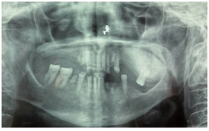 Figure 4 Panoramic view revealed radiopacity extending from 24 to tuberosity and encroaching onto the maxillary sinus.