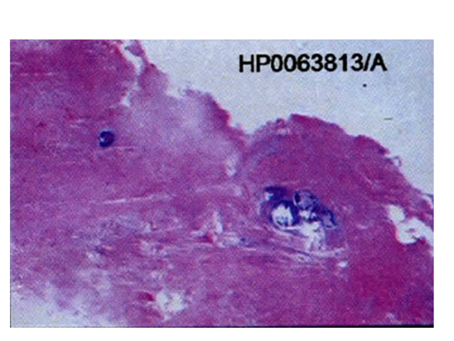 Incisional biopsy followed by surgical resection of the left posterior maxilla was done under general anaesthesia (Figure 6A‒6C). Histopathology revealed proliferating fibroblastic stroma without any mitotic activity and with the deposition of lamellar bone. Connective tissue stroma comprised of plump spindle shaped fibroblasts. Trabecular ossification showed osteoblastic rimming (Figure 7). The result of which confirmed the diagnosis of ossifying fibroma and the patient is under regular follow up.