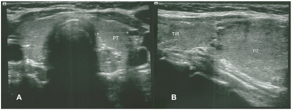 Figure 1 Ultrasound of neck: Showed upper left 8mm thyroid nodule (TIR), and lower left 30mm parathyroid (PT).