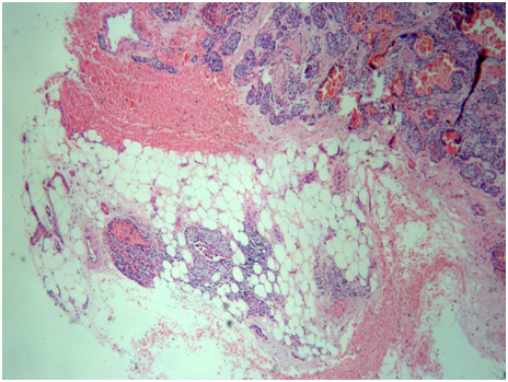 The final histopathology study revealed a 3.5cm x 3.2cm hard nodule adjacent to the left thyroid lobe (Figure 5). The lobe was surrounded by a dense, fibrous capsule that adhered tenaciously to adjacent tissues. Histology showed that chief cells, the predominant cell type, were arranged in solid sheets and organoid groups with a trabecular pattern that infiltrates the capsule and extended to the periparathyroidal adipose tissue with perineural invasion (Figure 6). There was mild atypia cellular without mitotic activity. Scattered foci of comedonecrosis occurred at the periphery of the neoplasm. There were no vascular invasion and no metastatic lymph nodes found. The final diagnosis was a parathyroid carcinoma minimally invasive. No radiotherapy or chemotherapy were administrated. After a period of 44months follow up, not recurrence was detected.
