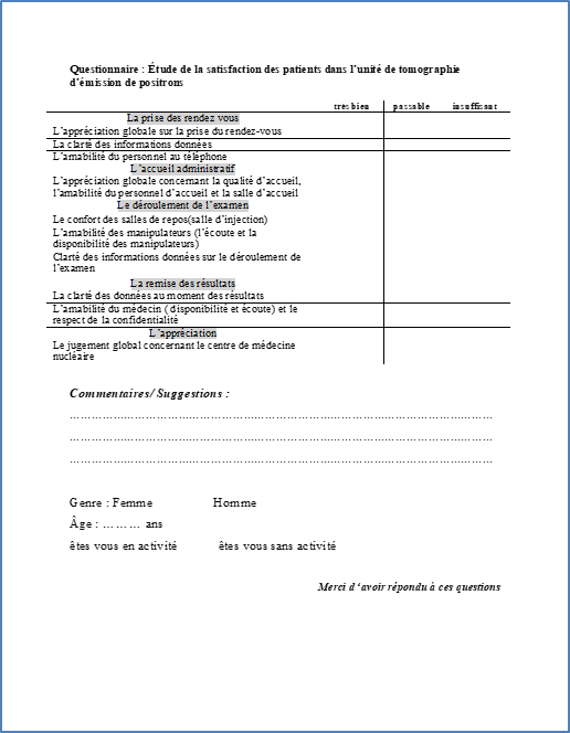 It is therefore within this framework that at the level of the Positron Emission Tomography unit coupled with computed tomography (PET-CT) recently installed in the nuclear medicine department at the Salah Azaïez Institute that a satisfaction survey of patients who had a PET-CT examination in the framework of exploration of their pathologies was carried out.