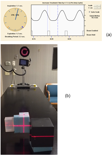 A Varian 4D camera was used to catch the signal. Figure 3 shows the camera and the motion phased signal. The motion was simulated to be 2.3 second breathing period and about 1cm amplitude.