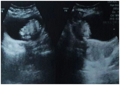 Figure 2 Pelvic trans abdominal ultrasound image showing echogenic mass in the urinary bladder lumen with normal uterus.