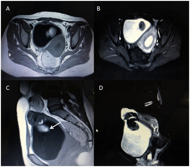 Figure 3 Pelvic MRI showing a well defined supra and intra vesical mass with breech in the dome of the bladder. (A) Axial T1 W image & (C) Sagittal T1 W image showing intra luminal bright area (shown by white arrow) with corresponding suppression on STIR (B & D) images s/o fat intensity.