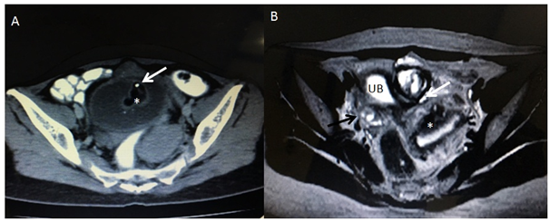 Figure 4 (A) Pelvic CT scan axial image showing intra vesical lesion of fat attenuation (asterisk) and focal calcification.(white arrow).