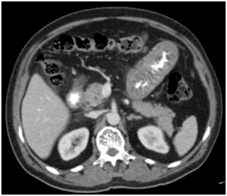 A 57year-old male presented to the Emergency Department (ED) with abdominal pain and nausea for 12hours. He had been hospitalized several times for abdominal pain in many different centers. In the ED, he was found to have moderate tenderness in all quadrants with a mild leukocytosis. His amylase level was 342U/L (normal: 23-85U/L) and lypase level was 550U/L (normal: 0-160U/L). He was admitted to the gastroenterology clinic with an initial diagnosis of pancreatitis and started on intravenous hydration. Ultrasonography revealed a normal-appearing pancreas and free fluid in Morison’s pouch and his right lower quadrant. In the left upper and lower quadrants, the bowel wall appeared diffusely thickened and echogenic with a narrowed, hypoechoic lumen. A diagnostic paracenthesis was performed and his serum ascites albumin gradient (SAAG) was found to be lower than 1.1. Peritoneal fluid cytologic examination revealed reactive mesotelial cells and no sign of malignancy. CT scan of the abdomen following intravenous and oral administration of contrast medium revealed a regular wall thickening of the duodenum and proximal jejunum with thickened mucosal folds (Figure 1). A CT Angiography was performed with the initial diagnosis of bowel ischemia. However, mesenteric vessels were totally normal. Five days after his admission, his abdominal pain completely relieved and Ultrasonograpy showed that his intestinal walls had returned to normal and ascites had disappeared. He was discharged but referred again with same complaints four days later. He was found to have tenderness in all quadrants with a mild leukocytosis and the bowel wall appeared diffusely thickened on Ultrasonography just like his previous admission. An upper gastrointestinal endoscopy was performed. Duodenal and jejunal wall biopsies revealed mild inflammation. His colonoscopy was totally normal. He was discharged after his symptoms improved. On his third hospitalisation with same reason on our center, a diagnostic laparotomy was performed and no gross pathology other than edematous omentum was observed. Omental biopsy revealed congestion, mature adipose tissue with minimal inflammation. To exclude the diagnosis of Familial Mediterranean Fever (FMF) which is common in Turkey and is a cause of recurrent peritonitis, FMF mutation panel with common mutations was requested and found to be normal. He was discharged after his abdominal pain gradually decreased and his laboratory results normalized. 5days after discharge, he presented with the same clinical picture and he was suspected of having hereditary angioedema and a reduced C1-INH protein level of 4mg/dL (Normal: 11-26mg/dL) was detected together with markedly lower C1-INH activity of <10% (Normal: 70-130%) and he was diagnosed with hereditary angioedema. He started on danazol. After Danazol treatment, he only had a mild episode over 3years of follow-up.