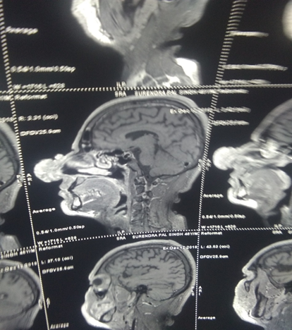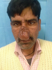 A 45 years old patient came to our OPD with a giant swelling of nose which was causing upper airways obstruction and difficulty in eating and breathing. It caused a lot of aesthetic and psycho-social disturbance to the patient (Figure 1). MRI of the patient showeda large well defined extensive cutaneous lobulated tumor with complete obstruction of the columella (Figure 2). No area of diffusion restriction and post contrast enhancement of soft tissues was noted.Surgical excision of the nasal swelling and full-thickness skin grafting of the defect was done.1