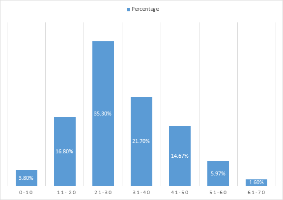 The distribution of patients who underwent CT scans for headaches was divided into 7 groups. The maximum number of cases was found in the age group between 21-30 years with 772 cases (35.3%) followed by the age group 31-40years with 474 cases (21.7%), Age group 11-20 years with 368 cases (16.8%), Age group 41-50 years with 321 cases (14.67%), Age group 51-60 years with 131 cases (5.97%), Age group 0-10 years with 83 cases (3.80%) and the least number of cases of 35 (1.67%) at the Age group between 61-70 years. (Figure 1)