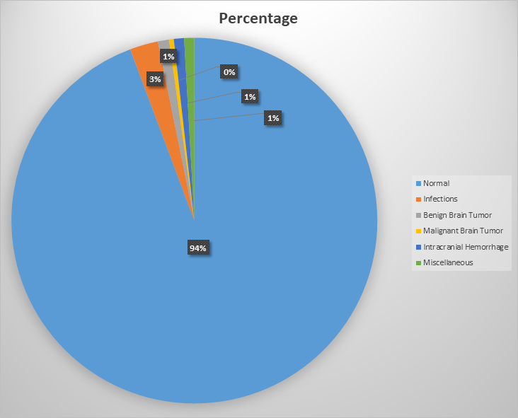 CT scan findings were Normal in 2060 cases which comprise 94.3 %, and positive in 124 cases accounting for 5.7 % of the total study. Among the positive findings, there were 30 cases (1.4%) of brain tumors with 21 cases of benign and 9 cases of malignant brain tumors, 54 cases (2.5%) due to infection, 20 cases (0.9%) of Intracerebral hemorrhage (ICH) and 20 case (0.9%) was due to miscellaneous cause. (Figure 2)