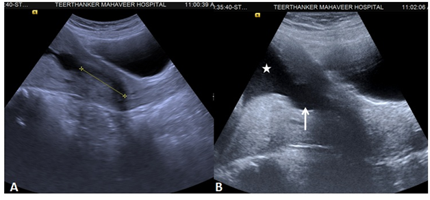 Figure 1 Transabdominal Ultrasound of the cervix. (A) Cervical Length measurement. (B) Funnelling of the cervix (white arrow) and amniotic fluid debris near internal os (asterisk*).