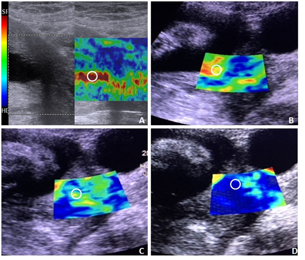 Figure 2 Elastographic images of the cervix at internal os (circles), (A) showing red -soft; (B) red and yellow-medium soft; (C) yellow and green-medium hard and (D) green and blue-hard. The color coding map is shown from the soft (SF) level to Hard level (HD) attached to the image A.