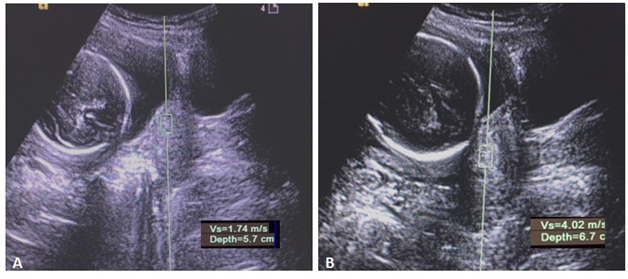 Figure 3 Shear wave elastography of the cervix. (A) Shear wave velocity is reduced indicating soft cervix. (B) increased velocity indicating the hard cervix.