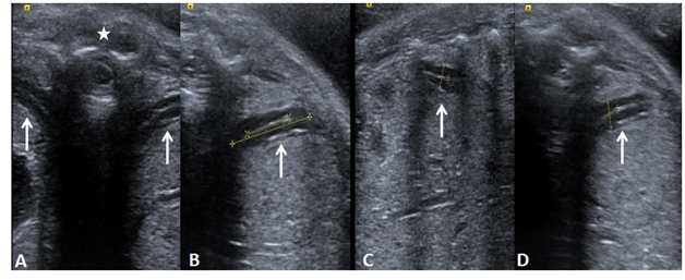 Figure 4 Magnified view of Ultrasound images of the fetal adrenal gland, (white arrows) in all three orthogonal planes, showing measurements of the fetal zone and corresponding widest dimension. (A) both adrenal glands in transaxial plane; (B) adrenal gland length; (C) adrenal gland width and (D) adrenal gland depth in Anterio-posterior axis. Asterisk (*) shows spine in the midline.