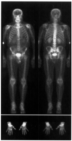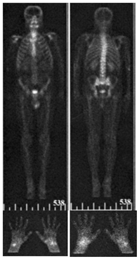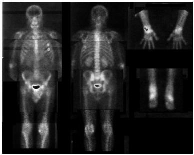 In December 2005 the patient felt himself well. He had no complains, gained 20kg in weight. All laboratory tests were normal as well as the abdominal CT. But in February 2006 articular pain resumed. Osteoscintigraphy with TC-99m pyrophosphate sodium was performed 03.03.2006 (Figure 1).