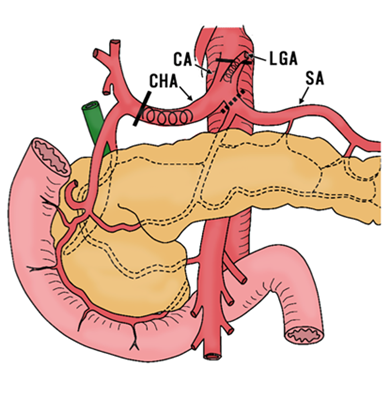 Figure 1 DP-CAR procedure with en bloc resection includes the celiac axis (CA), common hepatic artery (CHA), and left gastric arteries (LGA) (solid line). Standard DP procedure just preserved the celiac, common hepatic, and left gastric arteries (doted line). It had been often that embolization is performed to a left gastric artery and/or a common hepatic artery (spiral line).